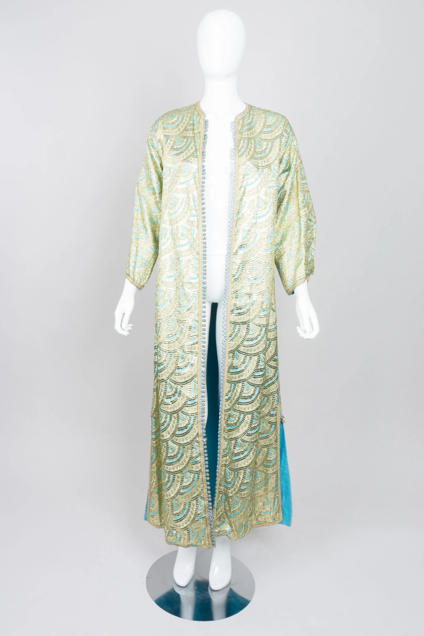 Long Moroccan caftan robe by Maroc. Brocade fabric shimmers with allover golden shine. Long row of fabric loops and knots runs down the center front opening and at the side vents. Lined in bright blue fabric, this piece makes the perfect topper for a romantic wedding gown- but we'd also happily wear it over a silk blouse and jeans or as a swimsuit cover up. Azure blue, gold.