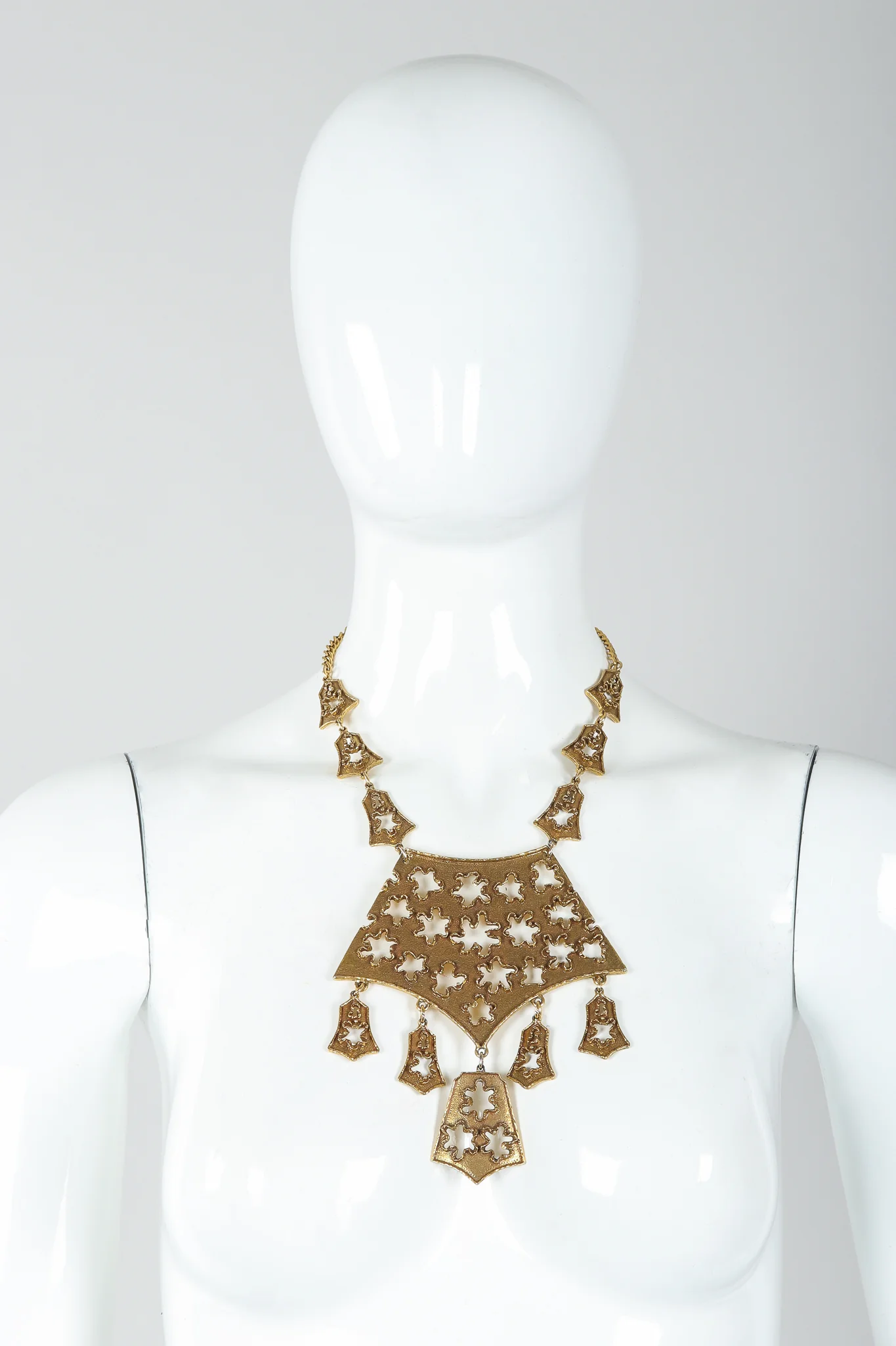 Textured brutalist plate necklace by Goldette. Sculpted plate with freeform cutouts has strong presence and adds heavy texture to any look. Floral, curved cutouts remind us of puzzle pieces, accented with bell-shaped charms, all suspended from curb link chain with hook clasp. Oval signature cartouche on back of center plate. We would wear with a floaty silk dress, ready for all of the parties. Antiqued gold.