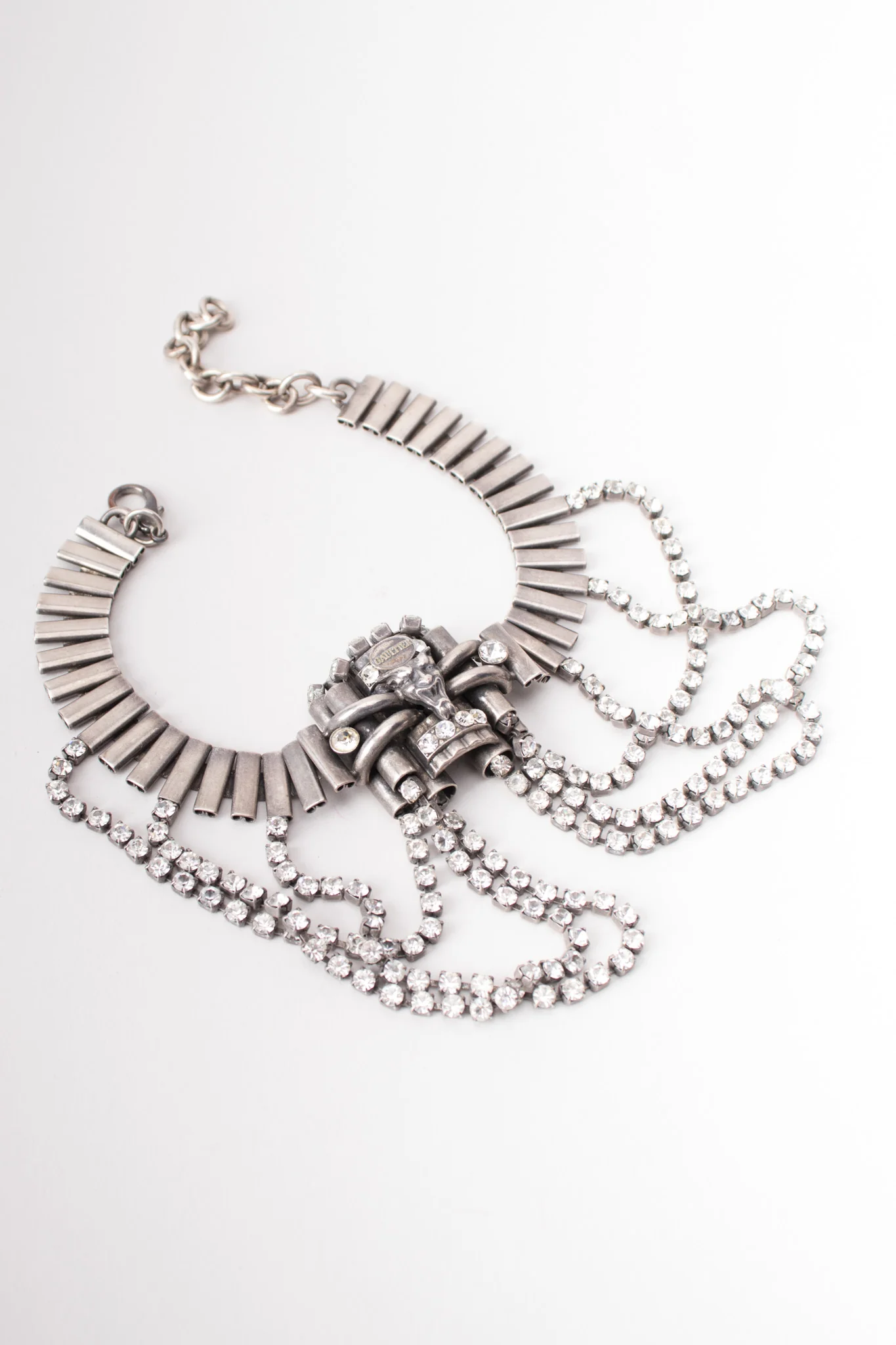Fantastical draped chain choker by Jean Paul Gaultier. A ghoulish demon is the centerpiece of this dark piece, adorned with draped prong-set rhinestone chains attached to a flat book chain choker necklace. Extender chain with lobster clasp closure. Signed oval cartouche on front center face. We would unleash our inner emo teenager out and would wear with a long, slinky black jersey dress and stacks of rings with a dark manicure. Pewter, crystal.