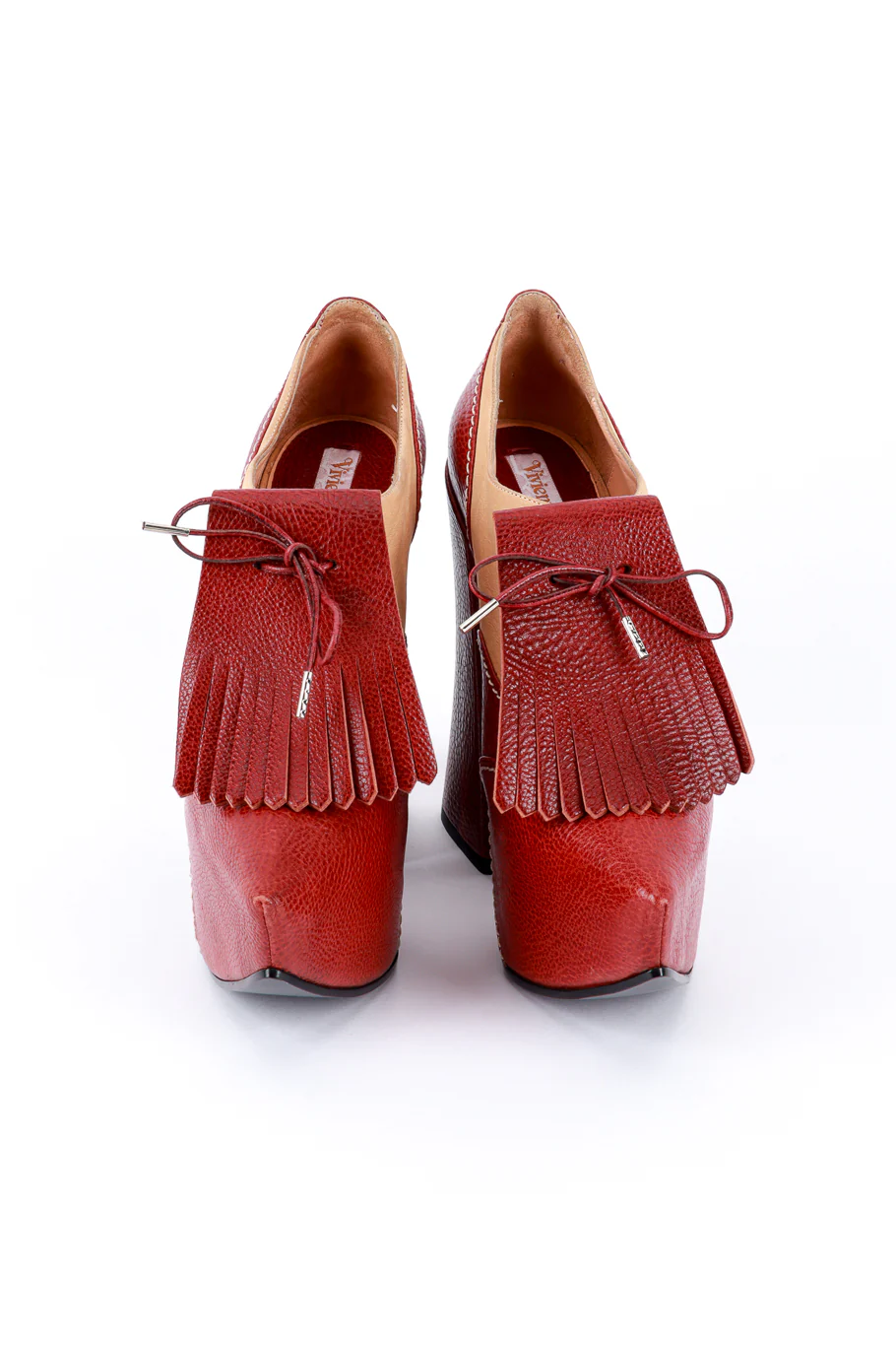Leather platform booties by Vivienne Westwood featuring a detachable kiltie fringe front in a brogue golf shoe style.