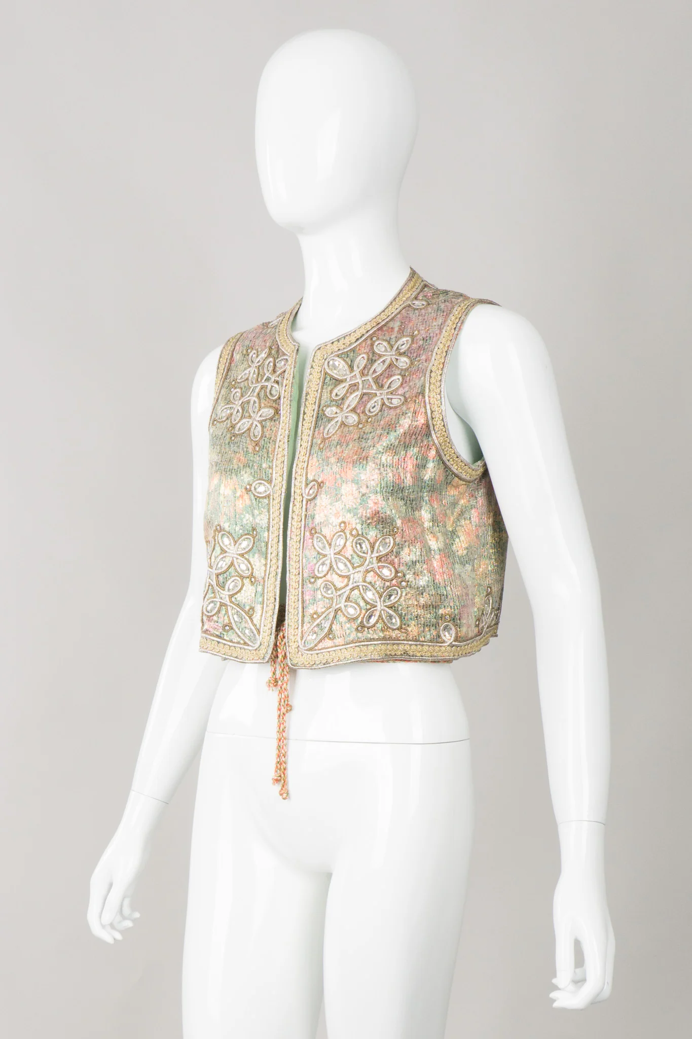 Lustrious metallic vest and tie belt by Oscar de la Renta. Impressionistic metallic florals are trimmed in gold braid and outlined in metal embroidery with oval rhinestone accents. Open vest with a hook-and-eye closure and weights at waist. Braided belt also features metallic thread throughout. We would pair this vest with a high-waisted pant, full sleeve blouse, and large drop earrings. Gold, bronze, green, poppy, orange, yellow.