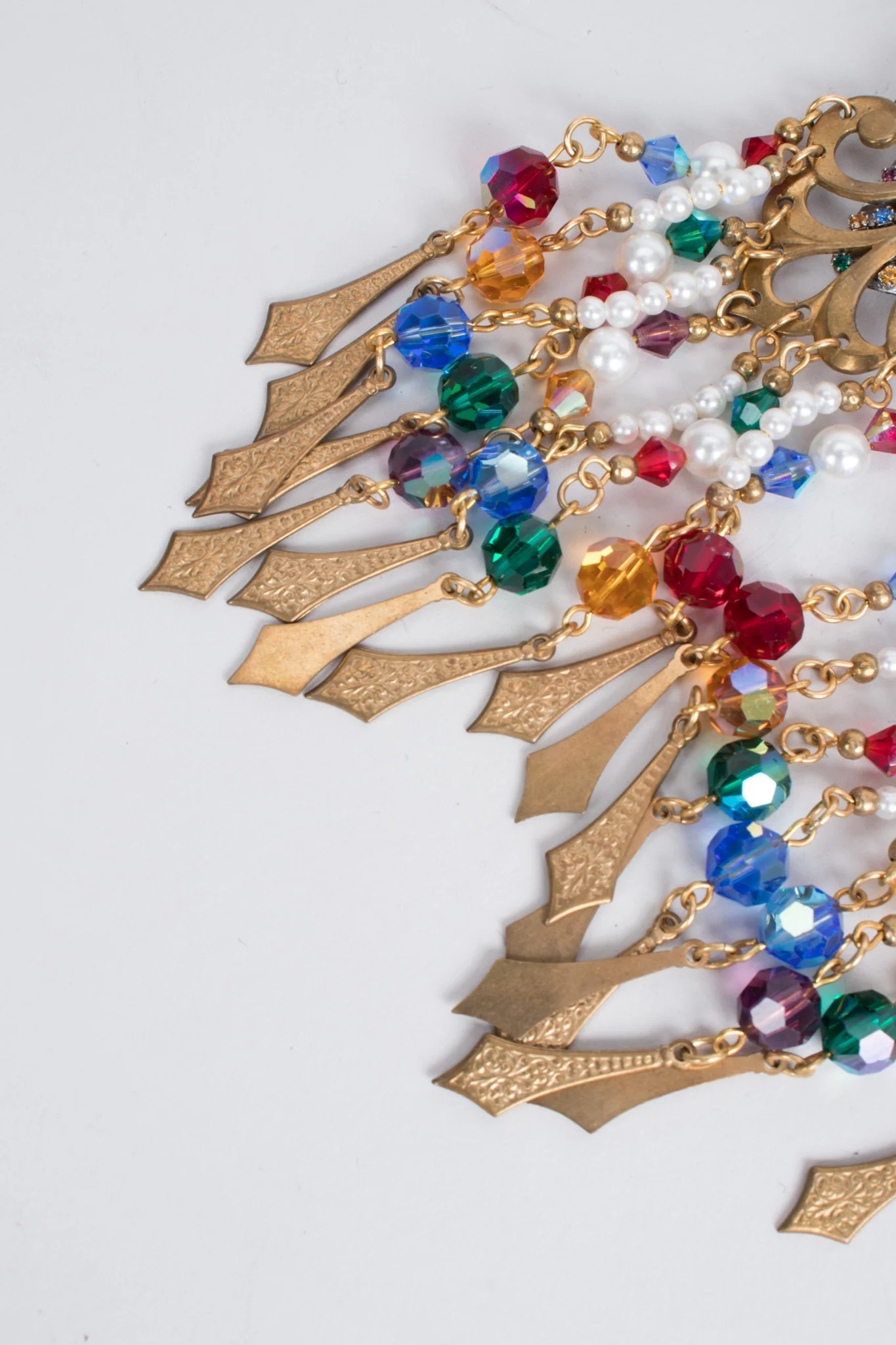 Fabulous statement earring with multicolor beaded fringe. We are in love with this oversized colorful clip on. A rhinestone-trimmed oval shield featuring a bright blue stone with faceted crystal and pearlized fringe, finished with dagger-shaped charms. We would wear everywhere- but especially great with floaty silky dress and statement belt to tie it all together. Brass, silver, sapphire blue, pearl, topaz, ruby, emerald, blue, iridescent.