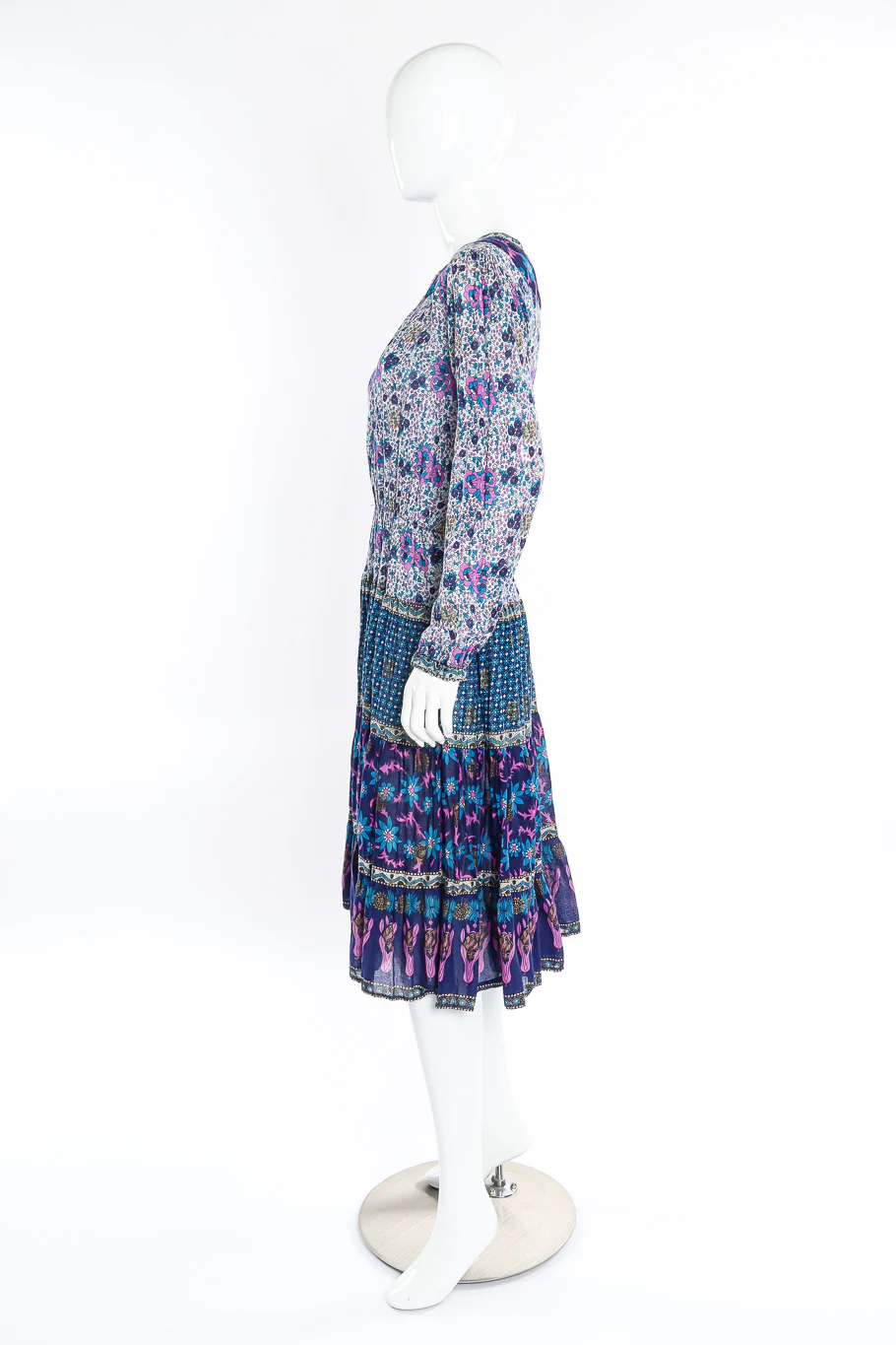 Printed Indian cotton gauze peasant dress we believe to be by Kaiser.- Semi-sheer soft cotton voile tiered peasant dress