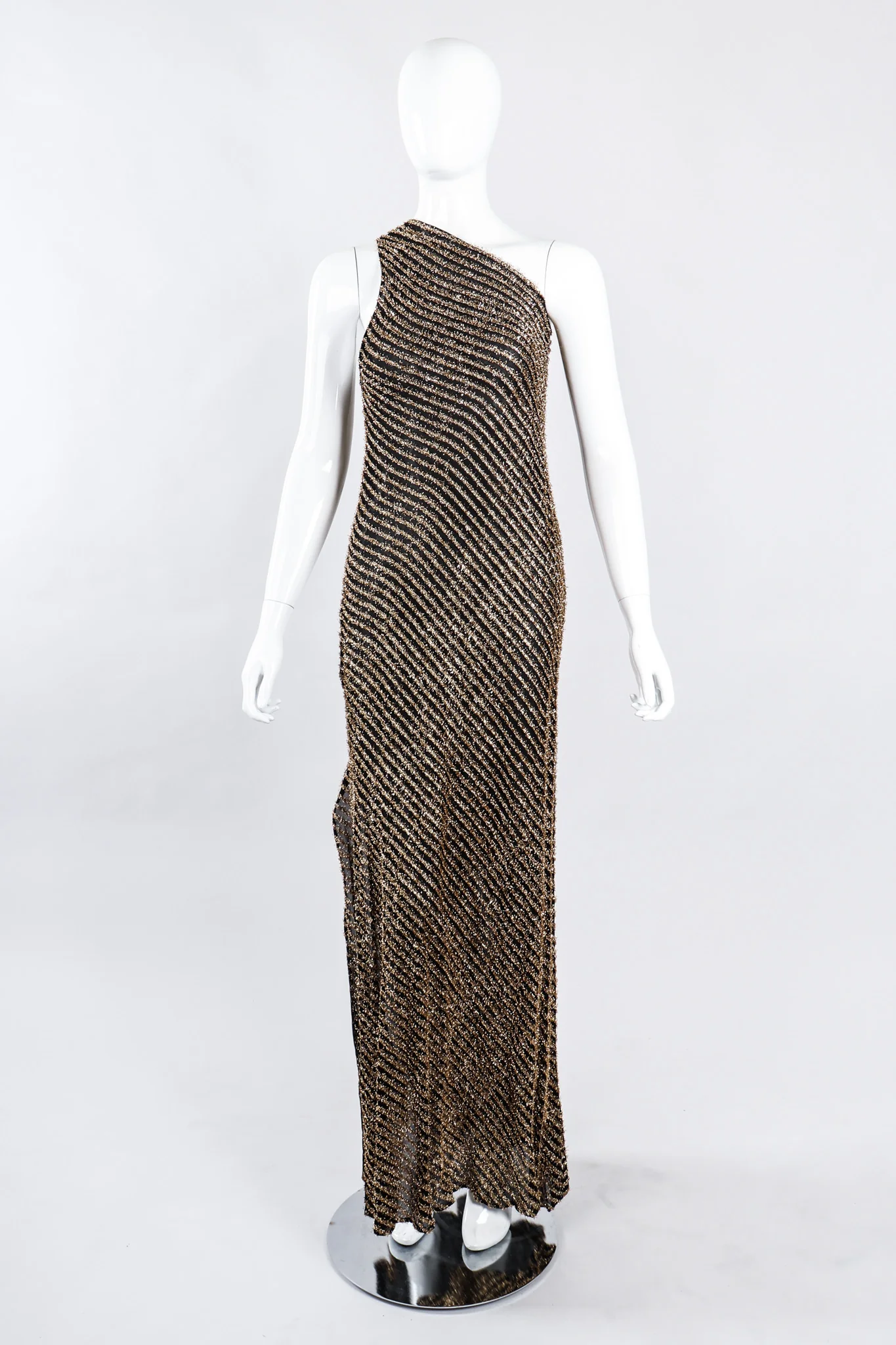 Asymmetrical one-shoulder gown in gold lamé by Stephen Burrows. Perfect for a night of dancing in fun city, this metallic lamé striped dress is cut on the bias in a lightweight sheer chiffon base that was made to move. Pull-on style dress features a sky-high side slit and large armholes for full ease of movement. We would wear with a strappy gold sandal, gold metal clutch, and wide cuff bracelet for New Year's Eve, or our next night out. Black, gold.
