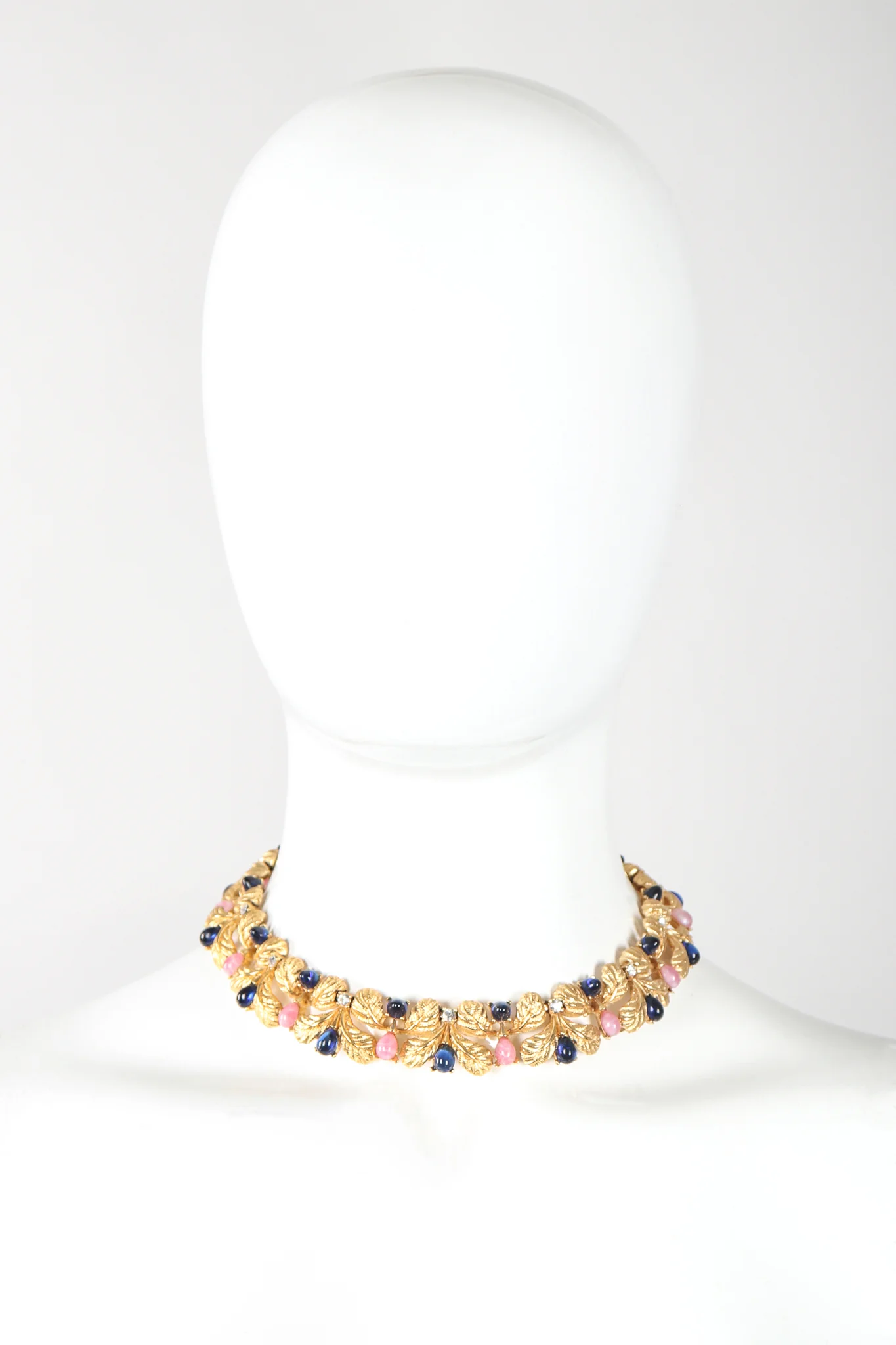 Golden cabochon necklace by Carven is an opulent, regal collar fit for a starlet of any era. Hollywood Regency-inspired sculpted feather links are punctuated with polished glass and crystals. Smooth oval and egg-shaped glass cabochons in rich sapphire blue alternate with milky pink stones and round prong-set rhinestone crystals. Fold-over clasp provides a seamless finish. We would wear with a luminous strapless silk sheath gown and opera-length gloves, finished with an oversized cocktail ring. Gold, sapphire blue, crystal, cornflower pink, white.