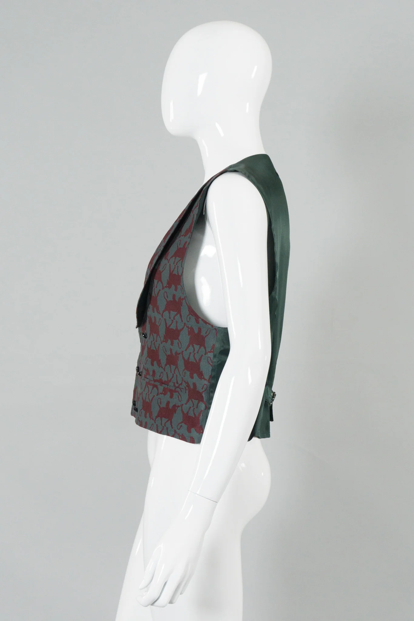 Flying griffin vest by Jean Paul Gaultier Homme has unisex style. We'd love the look on both men and women, paired with a wide leg trouser and gleaming white sneakers. Double-breasted suiting vest with black faceted bead buttons. Hunter green and burgundy.