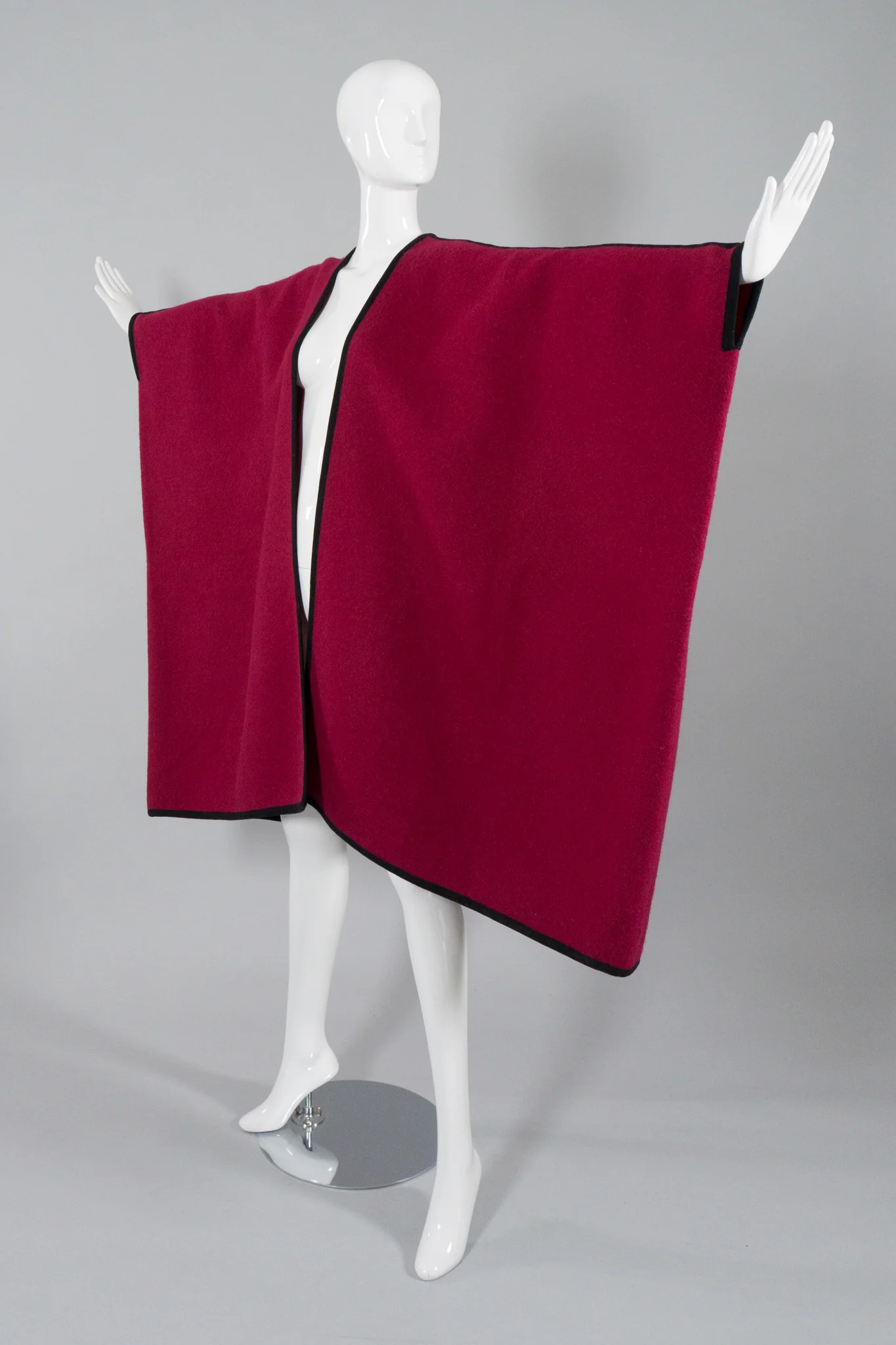 Wool cape coat by Calvin Klein has a strong silhouette and is made for movement. Rectangular, kimono-style sleeves are outlined in thick black lines and create a graphic statement. Deep magenta.