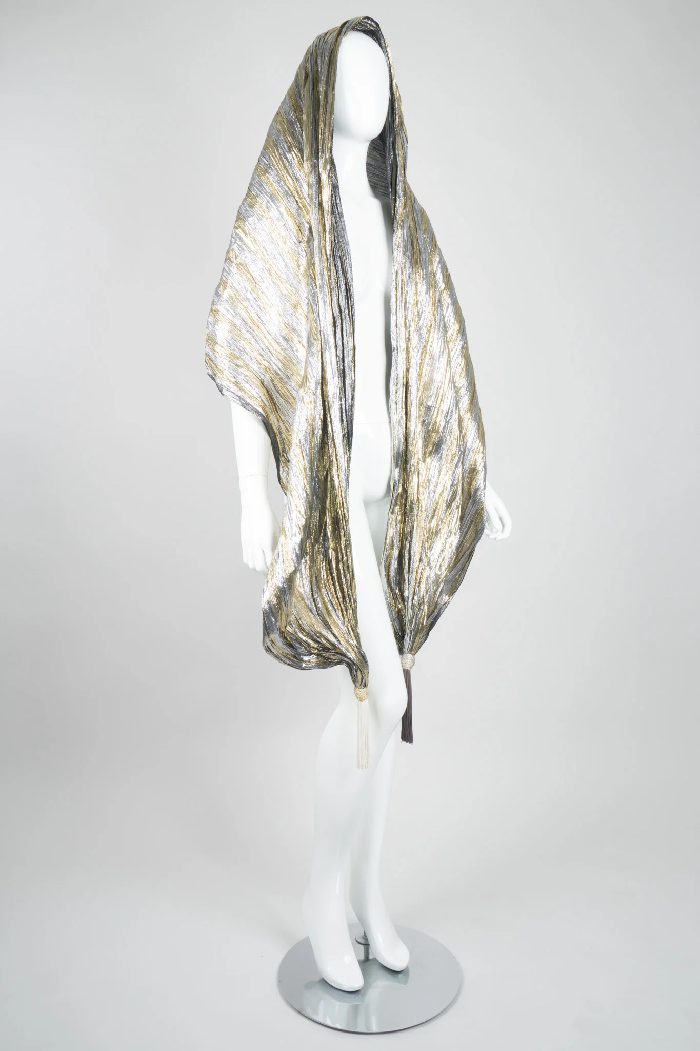 Oversized metallic lamé scarf finished with silky tassels. This large scarf is wide enough to cover the shoulders and doubles as a shawl. It is perfect as a formal wrap, but can easily transition to a swim cover-up for your next Palm Springs pool party. Versatile and lightweight, this wrap can work its way through any closet or even carry-on. Gold, silver, black, cream, steel grey.