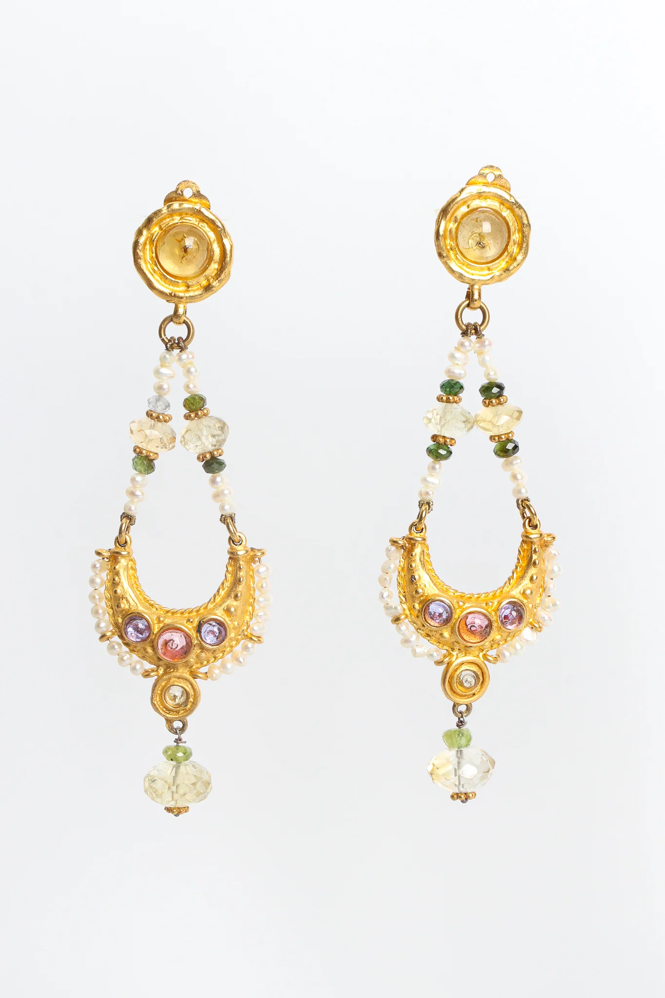 - Clip-ons, gold metal, faux pearl, glass beads, crystals