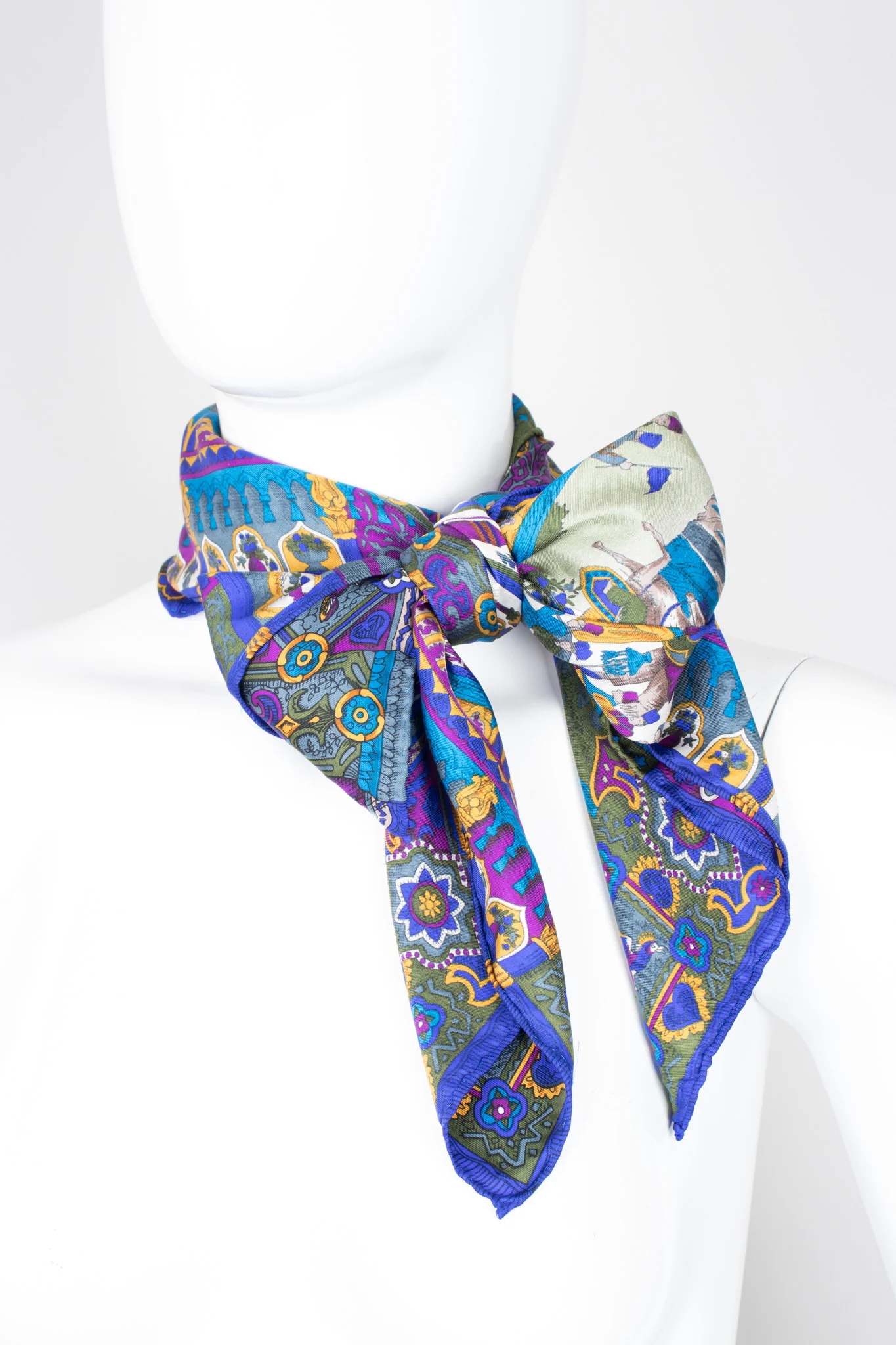 Festive silk scarf by Moschino featuring a Moroccan inspired parade with musicians, camels, flags, and army men in a lush backdrop of Arabesque flourishes, palm trees, and towers. We love the stately and regal feeling of this piece, and are immediately transported to a faraway place. Finished with a hand-rolled hem. Royal purple, cobalt blue, azure blue, mustard gold, olive green.
