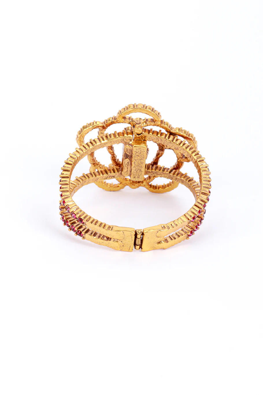 Wide cut out hinged bangle featuring a shimmering rhinestone rose by Oscar de la Renta.