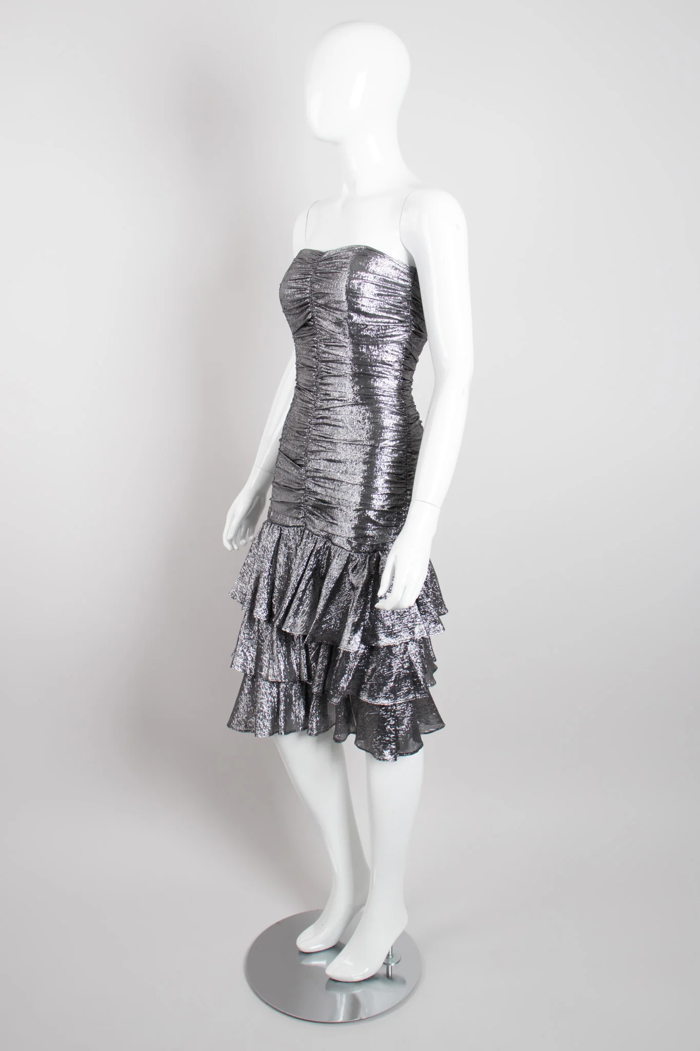 Metallic lamé flounce dress by Lilian Fell for Pronostic. Ruched strapless tube dress features boned bust for structure and a tiered ruffle skirt. Dropped waist with back zipper and hook-and-eye closure. The short tiered skirt was made for dancing, and we would wear with bright, colorful accessories like red velvet strappy heels, crossbody clutch, and oversized tassel or pom pom earrings. Gunmetal.