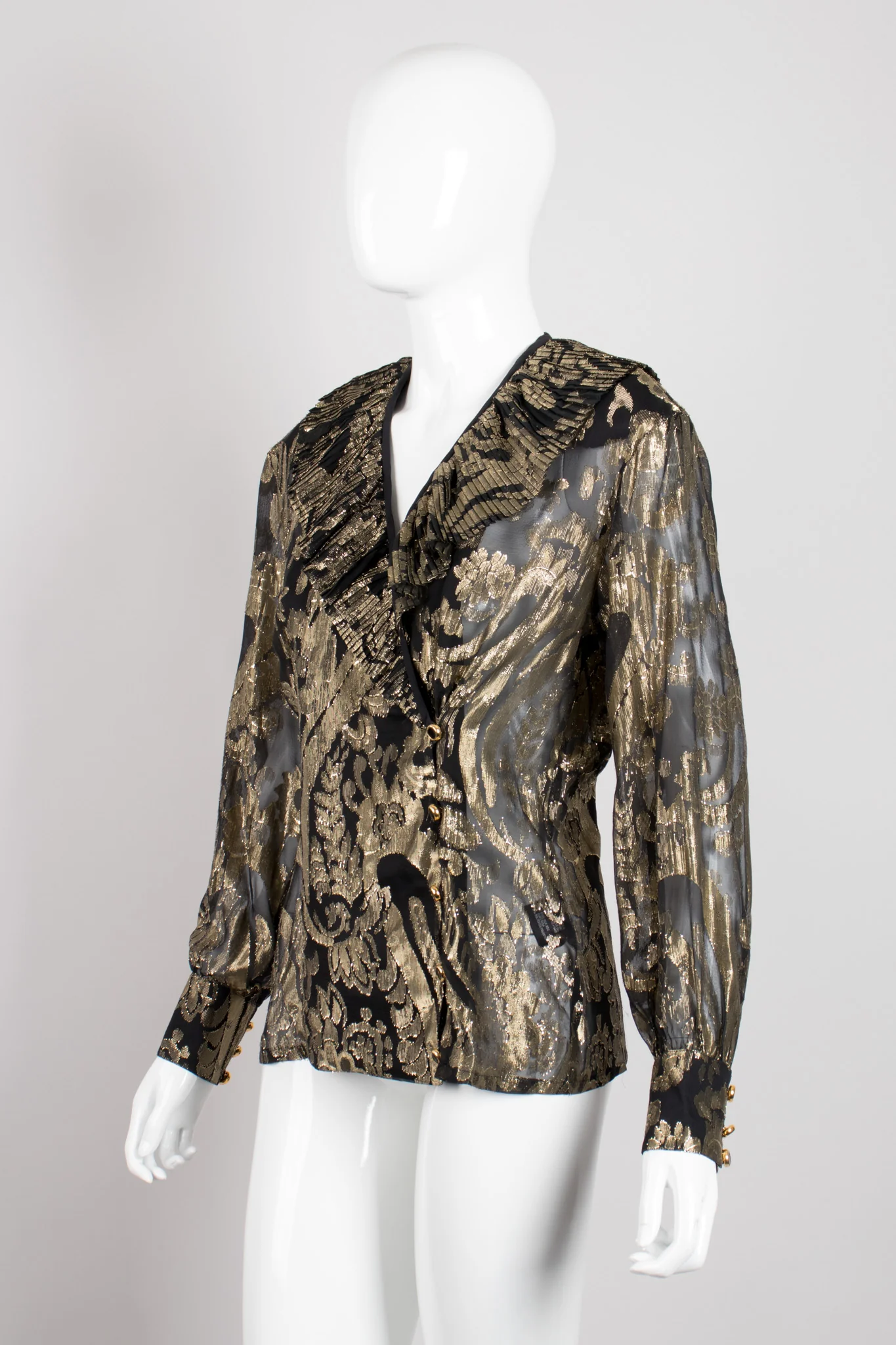 Sheer gold brocade wrap blouse by Escada. Metallic gold brocade on a sheer base is topped with a sharp knife-pleated ruffle collar, adding drama to this baroque look. Overlapping asymmetrical lapel features gold shank buttons and long sleeves with a 3-button cuff. Light shoulder pads for soft shaping. Extra button included. We would wear with a slim belt over a high waisted skirt with a vampy pointed toe heel and gold statement earring. Black, gold.