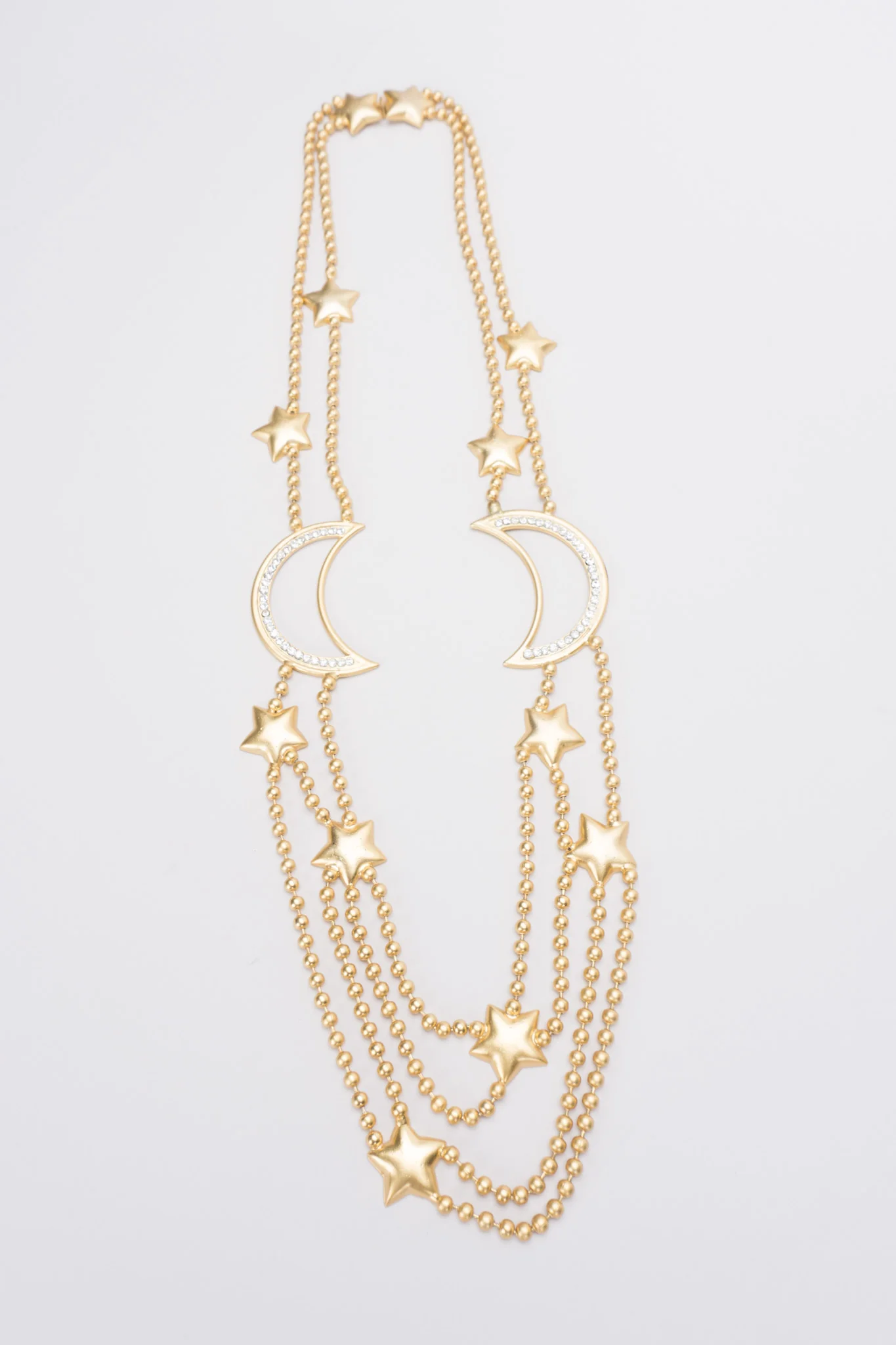 Long, layered celestial moon and stars necklace. Star-crossed paths take shape, traced in asymmetrical strands and highlighted with rhinestone lined crescent moons. Ball chains with box tab clasp. We would wear with our favorite long cardi, jeans, and a galaxy-printed headscarf. Matte gold, clear crystal.