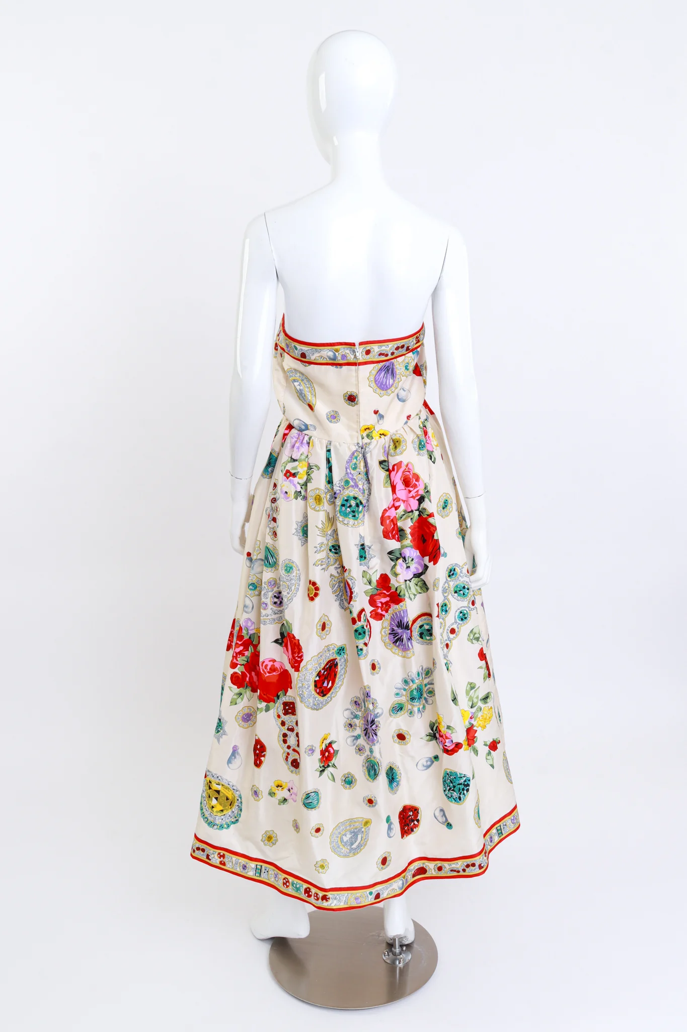 Whimsical strapless gown printed in a rich assortment of jewels by Leonard.