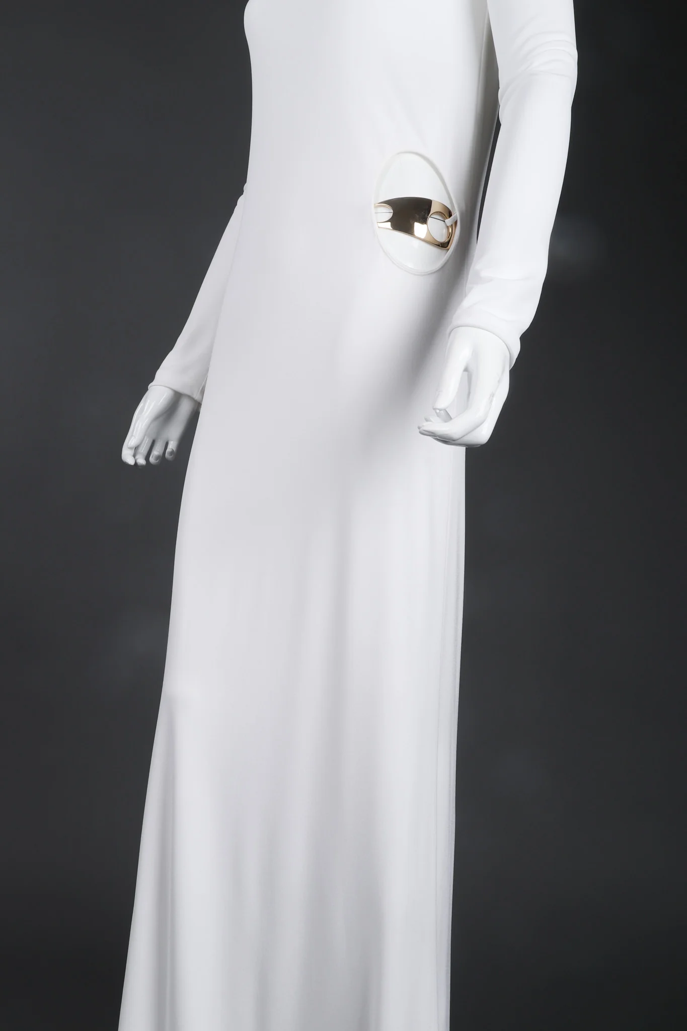 Iconic white jersey cutout gown by Tom Ford for Gucci from his 1996 white gown era. Highly collectable gown with gold hardware belt is a showstopper. Slinky jersey knit glides over the body in this lined minimal sheath silhouette. Pull-on style bateau-neck opening with long sleeves. Spaghetti waist belt with contoured gold hardware sits on the hips under the dress and is the pièce de résistance of this powerful look. We would keep the rest of the look sleek and channel our inner Kate Moss. Ivory, gold.