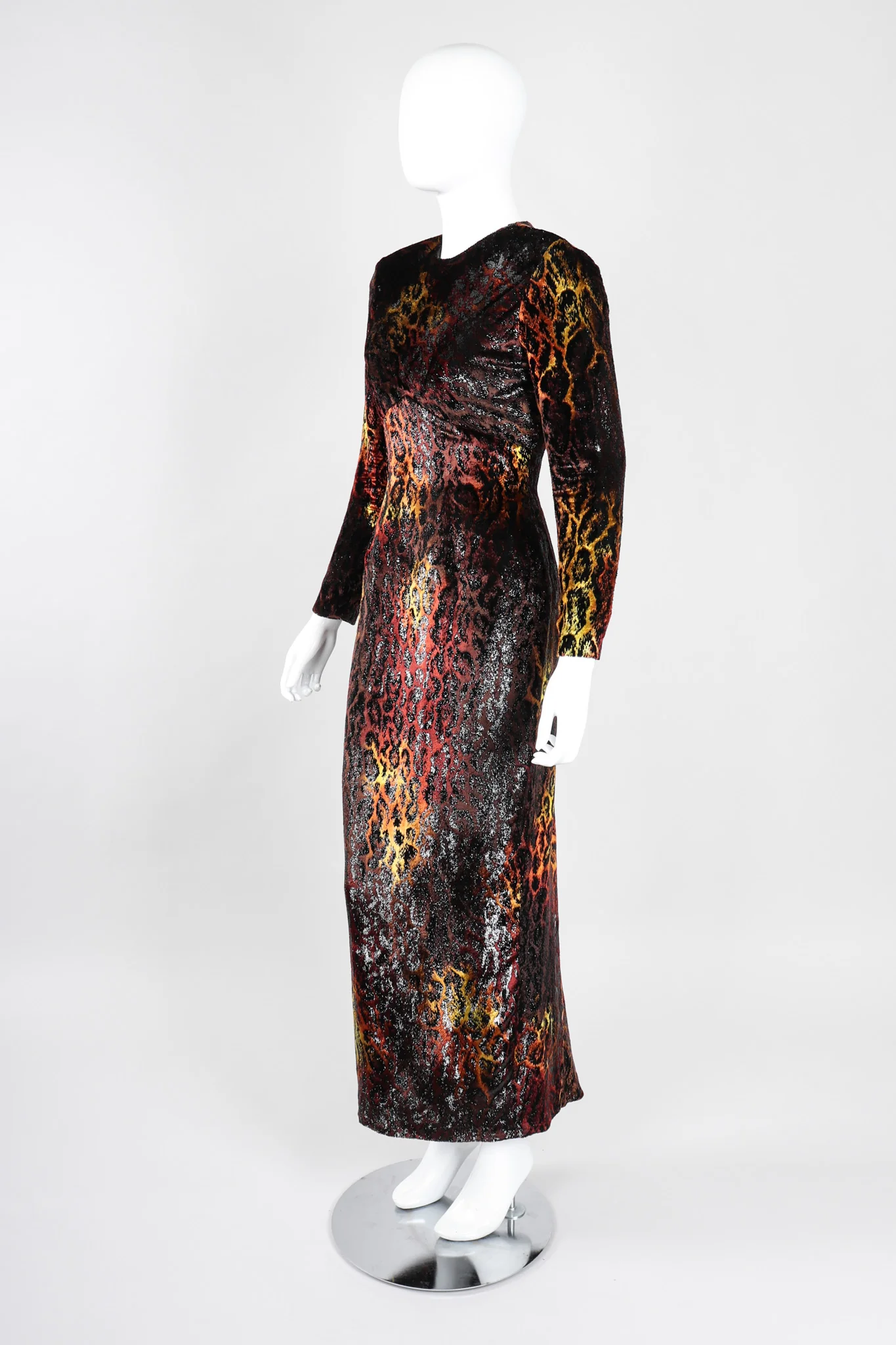Silk velvet lamé dress by Vicky Tiel is perfect on the prowl. Unleash your inner leopardess in this backless gleaming dress in a fiery palette. Fitted sheath silhouette skims all the curves with an empire bust seam and long sleeves with lightly padded shoulders. High neckline with two-button closure and zipper back with hook-and-eye. Finished with a slight fishtail hem with a godet for a little shape and movement. Fully lined with padded bust cups. We would wear with a sharp cat eye and statement earrings, topped with a leather jacket for an effortlessly cool look. Black, burnt sienna, dijon yellow, brown.