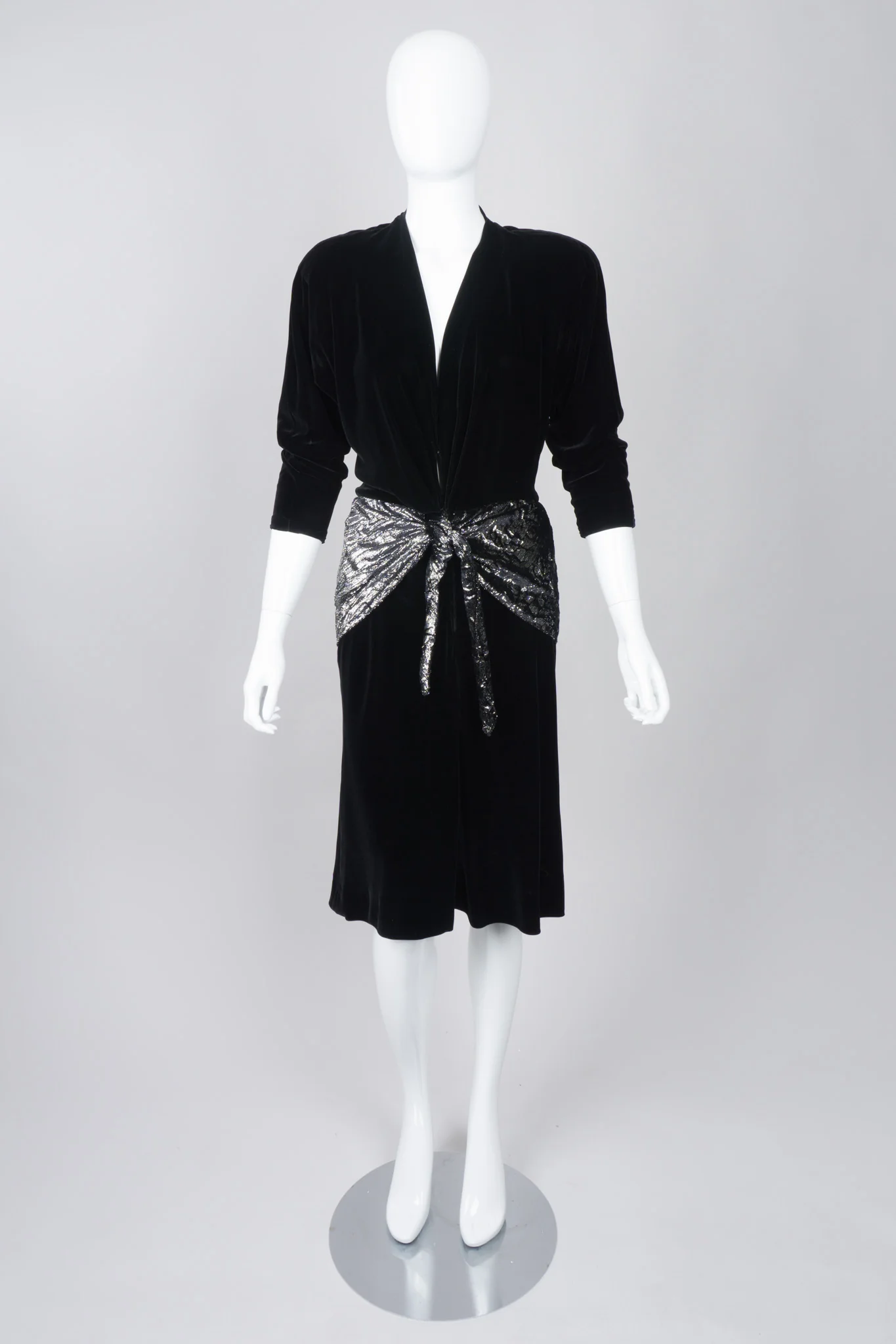 Lush velvet peplum dress by Jackie Rogers. Flattering sophisticated silhouette with a waist-tie peplum in sparkling silver lamé velvet. Long dolman sleeves with shoulder pads and a deep v-neck opening and front zipper. We would wear with a bold red lip, strappy red Manolos, and statement necklace. Black, silver.
